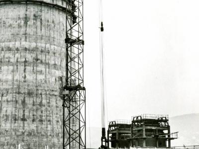 A fűtőmű és kéménye 1974–75-ben épült a Vegyépszer fővállalkozásában, a Hőtechnika Vállalat generálkivitelezésében. A monolit vasbeton kéménytestet csúszózsaluzással a 31. ÁÉV készítette. A százméteres szintig egy szűkülő másodfokú parabolaszelvénnyel emelkedik a kéménytest, ezt követően méterenként egy centimétert szűkül. A kéménytest falvastagsága a negyvenméteres szintig harminc centiméter, onnan egyenletesen csökken húsz centiméterig.