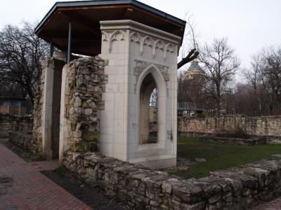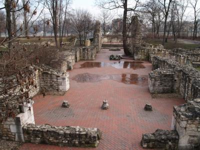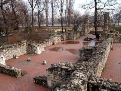 Az egykori ferences kolostort IV. Béla alapította a sziget déli részén, vélhetőleg a domonkos kolostor és a királyi ház építésével egyidejűleg. Templomát Szent Klára tiszteletére szentelték föl. Temploma csaknem olyan hosszú (47,9 m), mint a szigeti domonkos apácáké, szélessége pedig még nagyobb is (14,2 m). Máig megmaradt romjai a gótikus templomhomlokzat, az egyik oldalfal maradványai, a kolostori temető és a temetőkápolna. A romok megmaradásában az segített, hogy a kolostor romjainak nagy részét 1796-ban beépítették a nádori villába, amelyet később Nádor szállóvá alakítottak. A szálló maradványait 1945 után lebontották. Az ekkor kezdeményezett, majd az 1956-57-es régészeti feltárások a kolostor egyes újabb részleteit találták meg.
