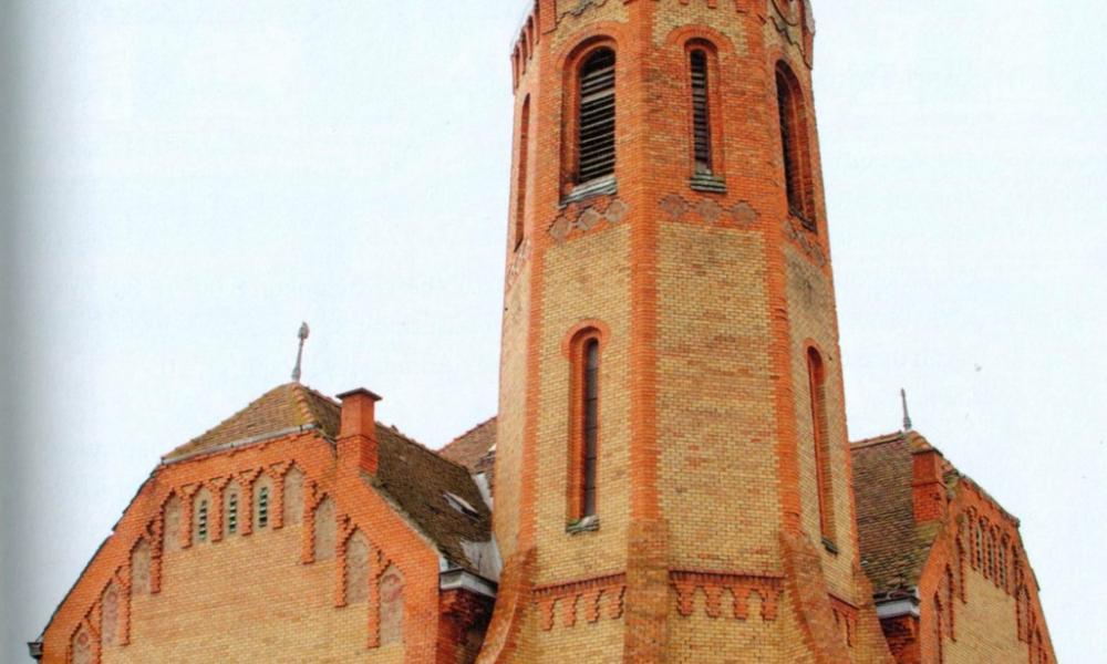 A templom alaprajza két, egymásnak forduló négyzet, találkozásuk északi sarkán emelkedik a hatszögletű, 42 méter magas, vaskos torony. Egyedi módon a torony alsó, kiszélesedő részén két bejárat is nyílik,a román templomok kapukiképzésére emlékeztető formájukkal. A templom külső homlokzatai vakolat nélküli, piros és sárga nyerstégla felületek, az ún. alföldi szecesszió jellegzetes példájaként.
