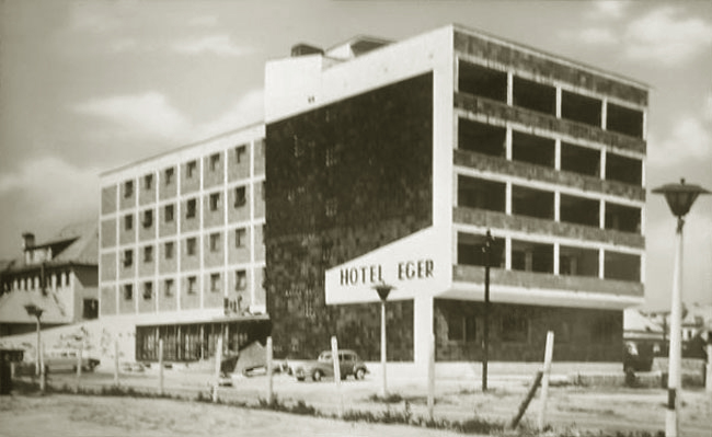 1961-ben kezdődött a Hotel Eger építése. A terveket a budapesti Középülettervező Vállalat kollektívája Perczel Dénes vezetésével készítette el. Közel 14 millió forintos költséggel épült, átadására 1963. augusztus 5-én került sor. A 76 szobás új szálloda külseje kék majolikás díszítést kapott, amely a kor elvárásainak megfelelően praktikus és könnyen mosható volt.