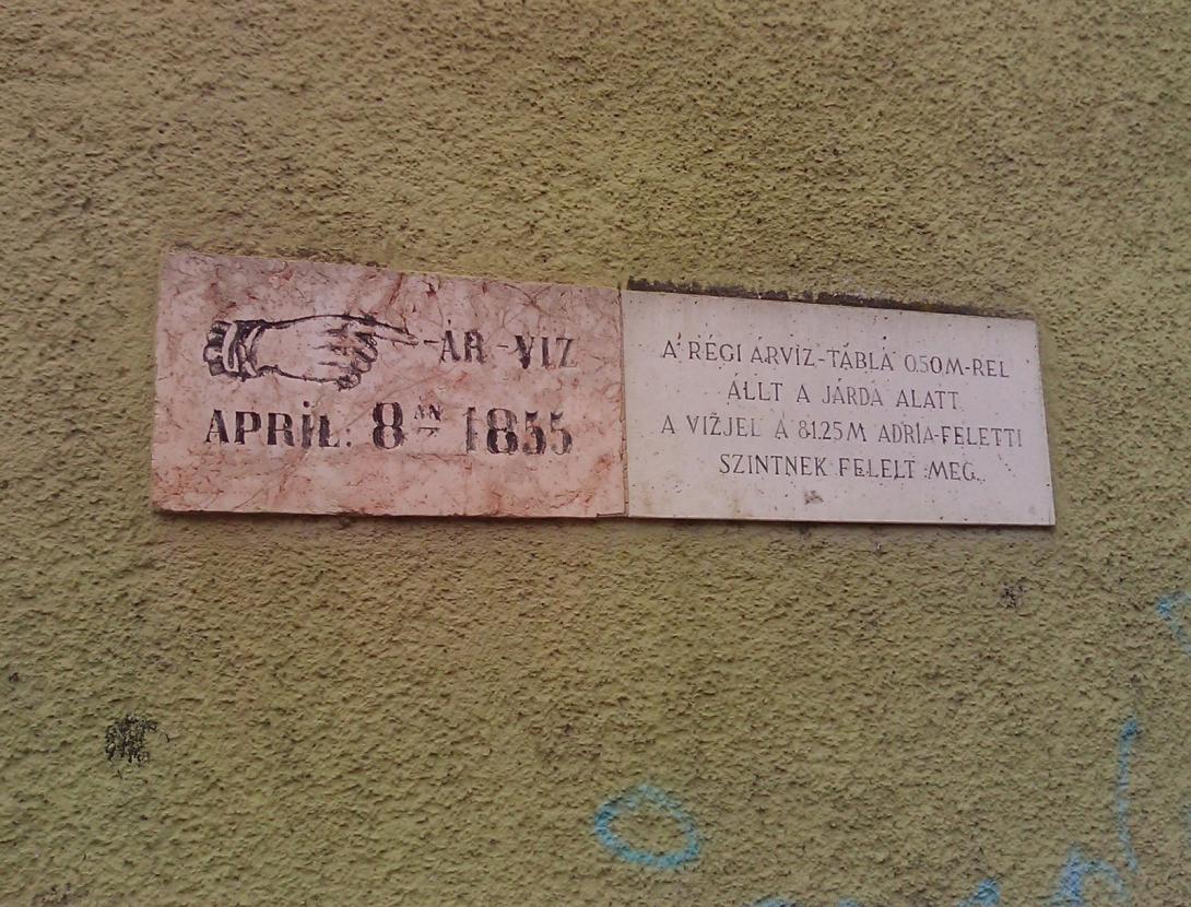 A víz szint jelző táblát feljebb rakták, mert 1879-ig a mai járdaszint alatt volt (a másik tábla ezt magyarázza)