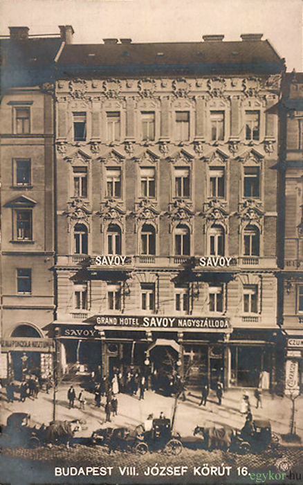 "Savoy Nagyszálloda Budapest, VIII. József-körul 16. A Nemzeti Szinház közvetlen közelében. A főváros legszebb és legmodernebb szállodája 120 szoba és szalon. Központi gőzfűtés, villanyvilágítás, lift. Hideg és melegvíz minden szobában. Elsőrangú étterem."