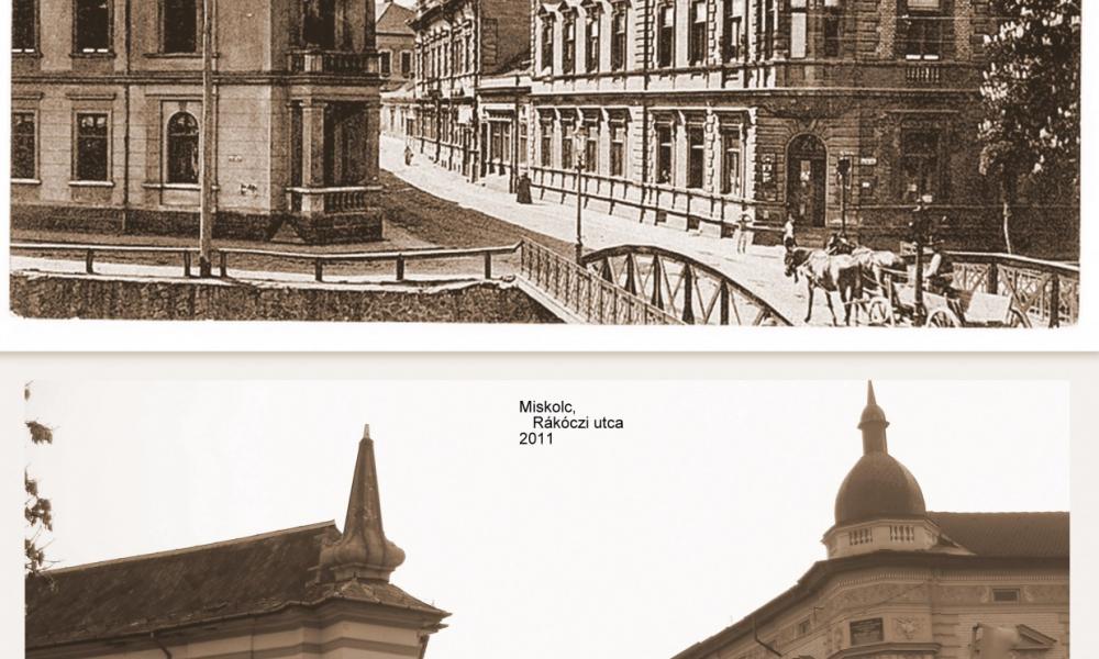 A két felvétel a Rákóczi utcán készült, csaknem 100 év különbséggel. (a Sötét kapu felől fotózva)